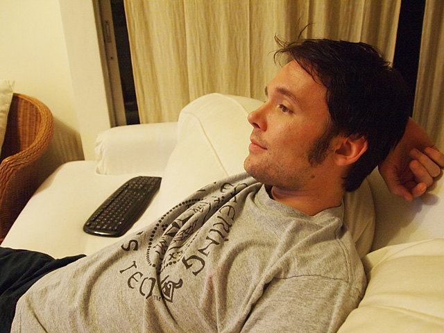 Him watching 2012 while I fiddle with the camera.